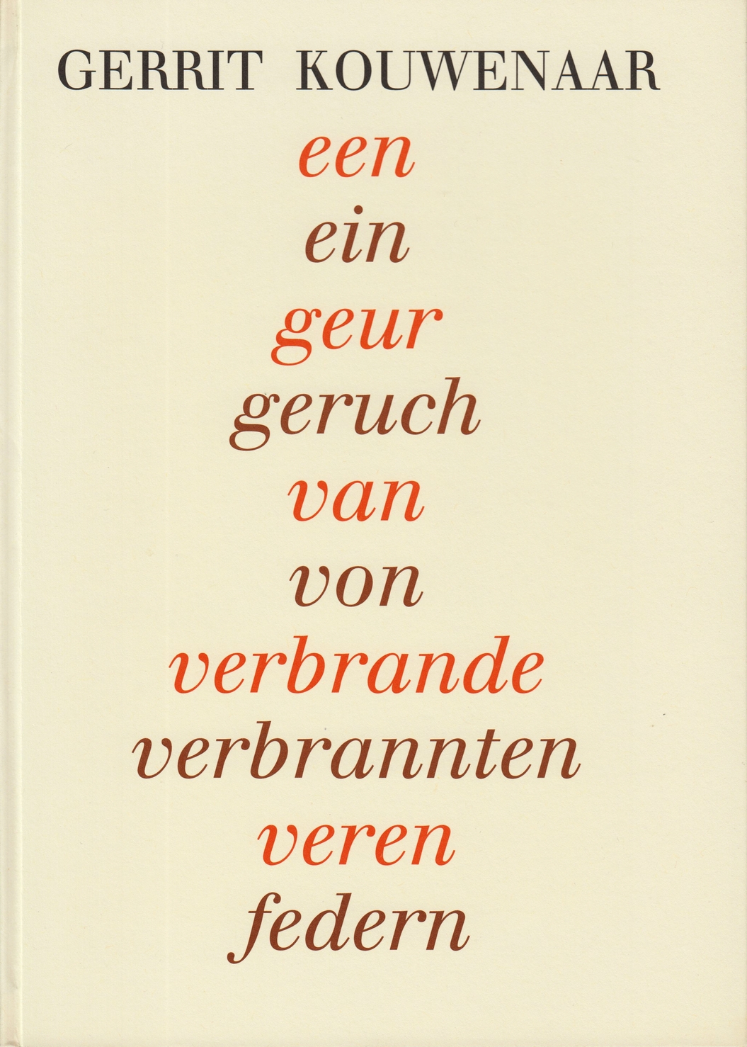 22. KOUWENAAR, Gerrit een geur van verbrande veren / ein geruch von verbrannten federn. Aus dem Niederländischen von Ard Posthuma. Münster, Kleinheinrich, 1996. 24 x 17 cm. Karton. 80 p. Met leeslint. 1e druk. Fraai.