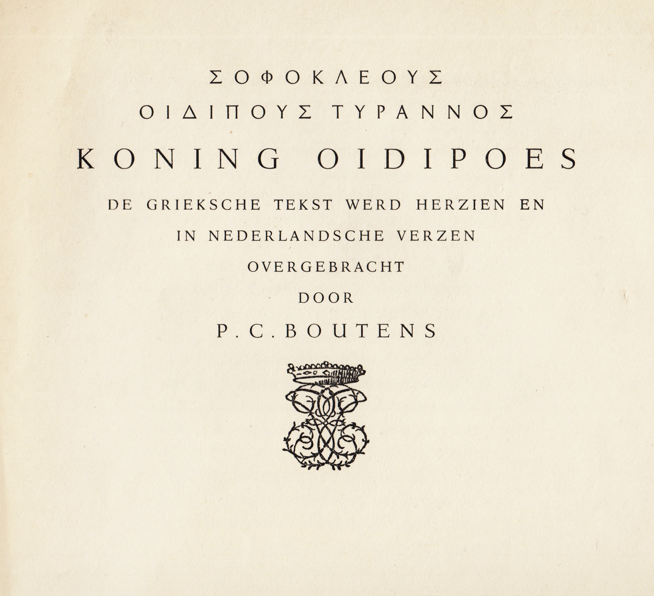 25. (KRIMPEN, J. van). BOUTENS, P.C. (vert.). SOFOKLES Koning Oidipoes. De Grieksche tekst werd herzien en in Nederlandsche verzen overgebracht door P.C. Boutens. Haarlem, Enschedé, 1929. 34 x 24 cm. Linnen. Kop verguld. (120) p. Gedrukt door Enschedé in een oplage van 150 exemplaren. (Schitterende) typografische verzorging door J. van Krimpen. Verbruind heraldisch exlibris van C.J.J.G. Vosmaer, klein nummertje in inkt in de rechterbovenhoek van de titelpagina.
