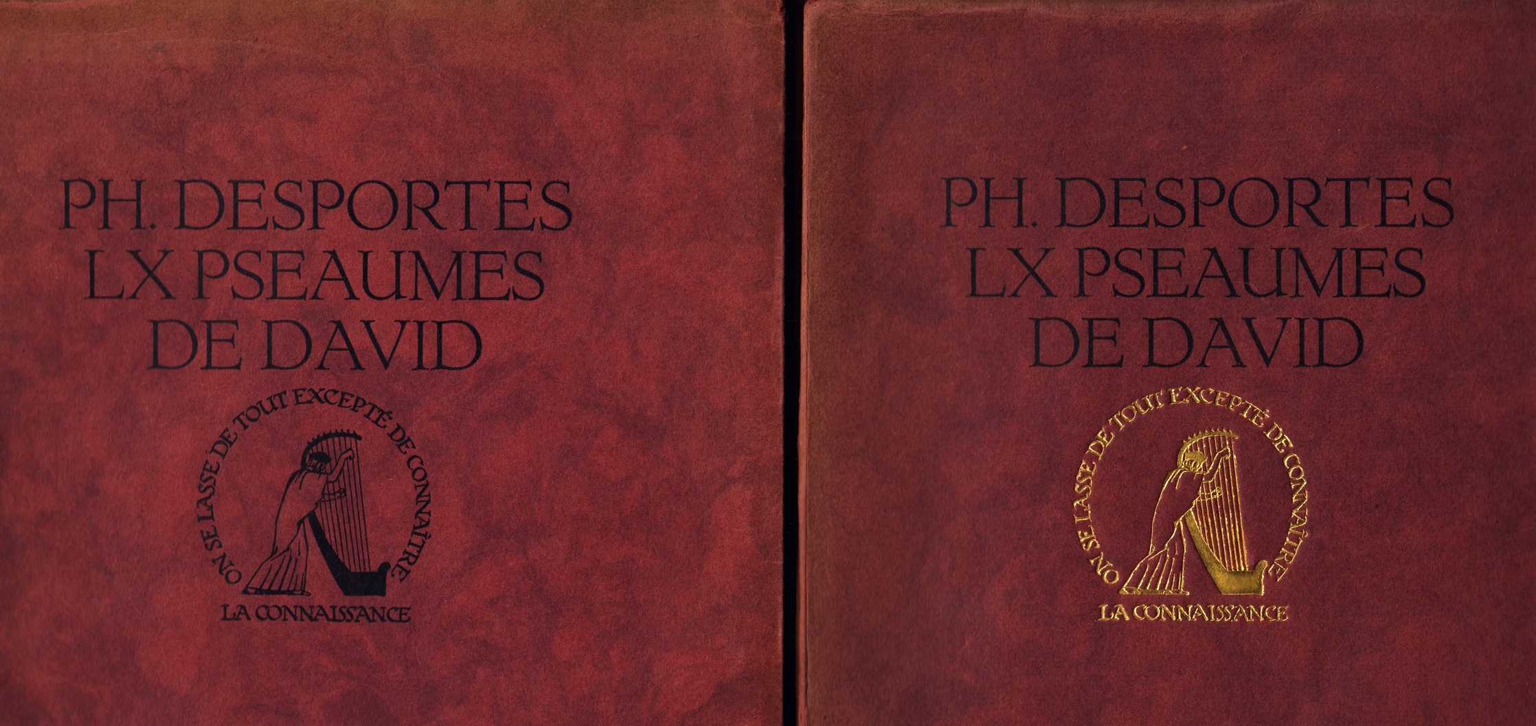 37. (RAEMAEKERS, Louis). DESPORTES, Ph. LX Pseaumes de David. (Met portret en titelvignet in houtsnede door Raphaël Drouart). Paris, La Connaissance, 1926. Ingenaaid met stofomslag, bedrukt in zwart en met het vignet in goud. 174 (= 172) p. Gedrukt door Charles Nypels in rood, blauw en zwart in een oplage van 430 genummerde exemplaren. Met portret en titelvignet in houtsnede door Raphaël Drouart. Onvermijdelijke lichte beschadigingen aan omslag.