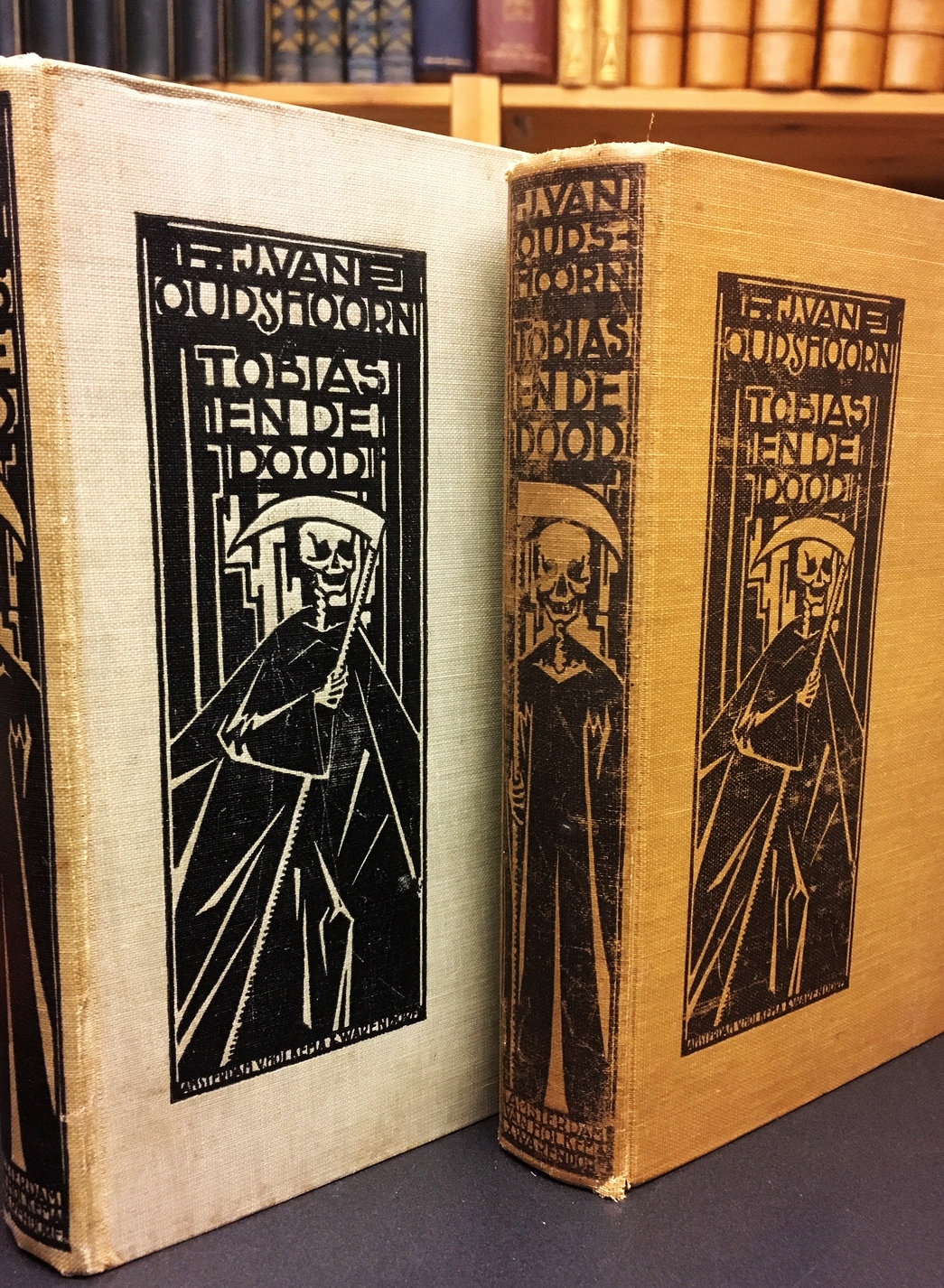 34. OUDSHOORN, J. van Tobias en de dood. Amsterdam, Van Holkema & Warendorf, 1925. Grijs linnen met bandtekening in zwart. Zwarte kop. 292 p. Niet afgesneden. 1e druk. Vage vlekjes op de band. Wat roest.