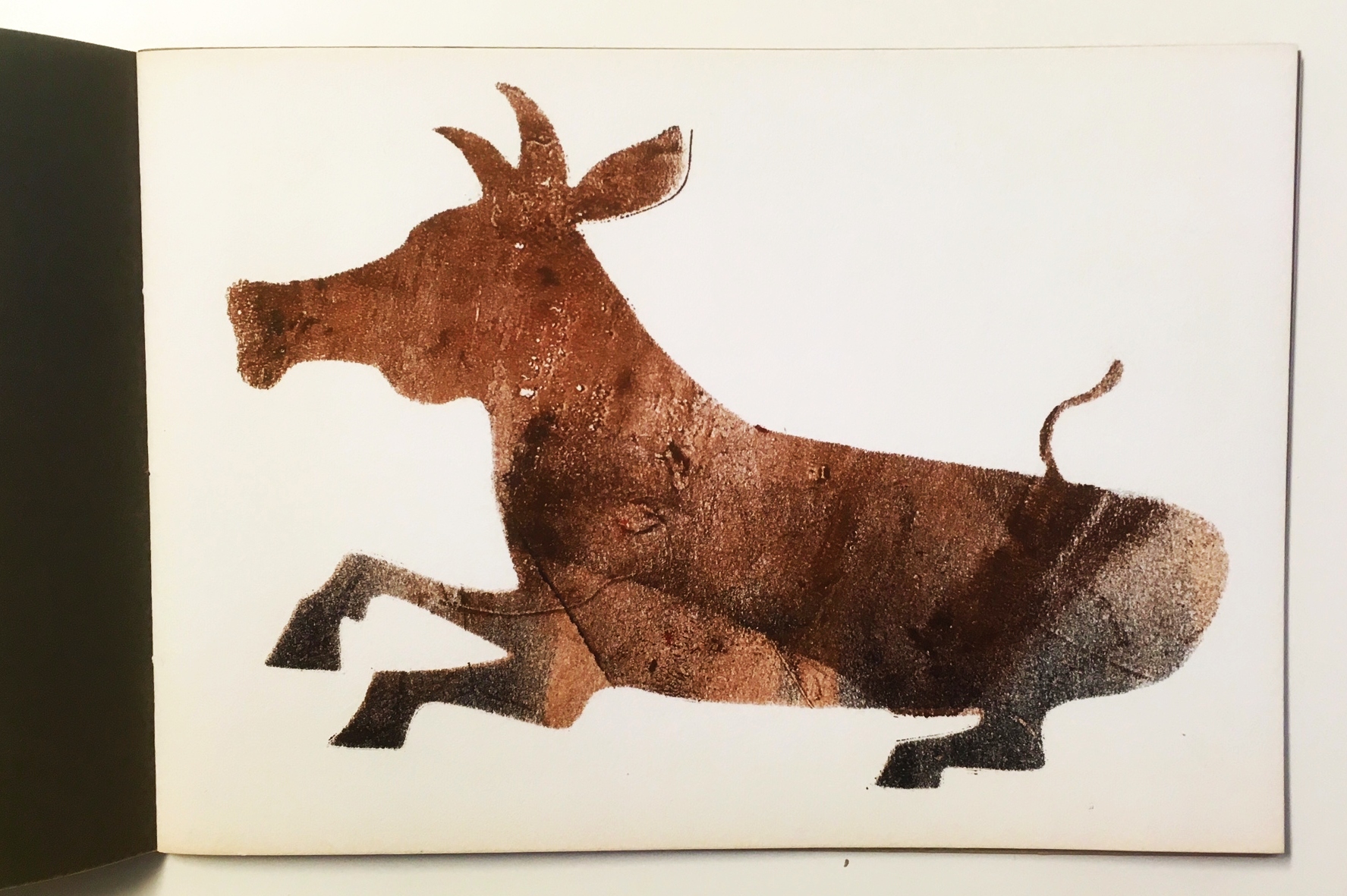 * Prachtig en origineel boekwerk, gedrukt met veel verschillende lettertypen en versierd met druksels van kleurige Lascaux-koeien.
