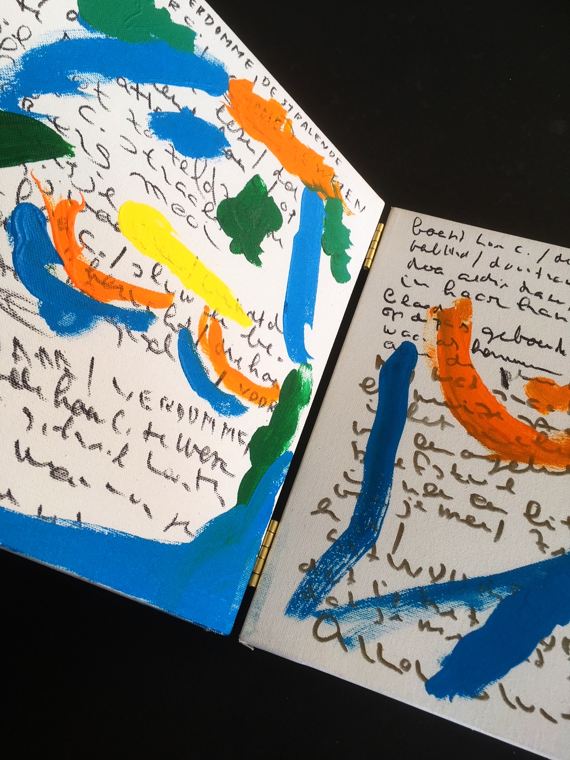 21. GRUNBERG, Arnon Ze stond daar verdomme mooi de stralende hoer C. te wezen. New York, Kunst Editions, 1998. 30,5 x 30,5/ 61,5 cm. Twee met twee scharnieren met elkaar verbonden linnen panelen, met bijgevoegd het colofon op een gelamineerd vel en een getypte transcriptie van het gedicht, eveneens gelamineerd. Vervaardigd in een oplage van 7 onder het colofon genummerde en gesigneerde exemplaren.