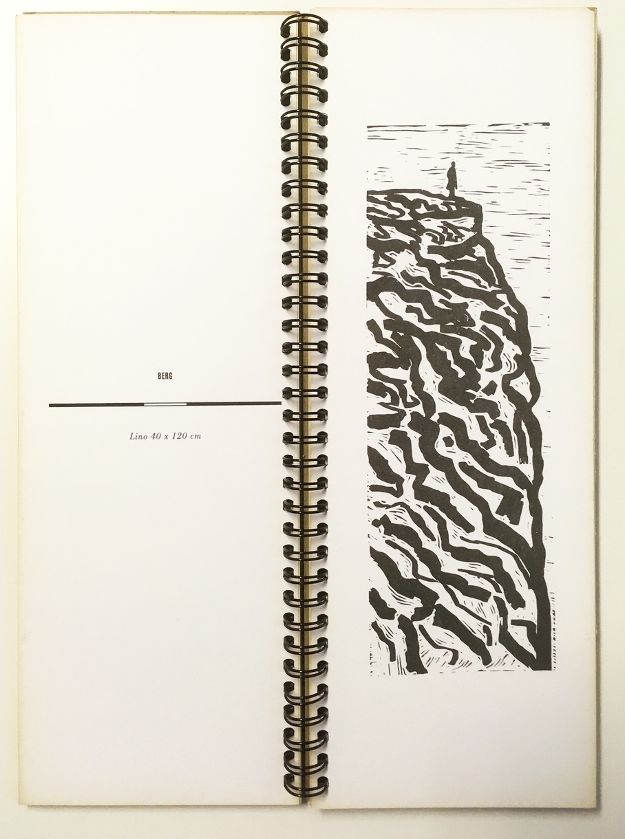 35. WAP, Jan Berg. 6 lino’s. 6 gedichten. (Een van 30 geïllustreerde exemplaren). (Homoet, Homoet Publishers, 1991). 29,7 x 10,4 cm. Ringband. (30) p. Op blokboekwijze gebonden. Met zes lino’s van de schrijver-kunstenaar. Ontworpen door Ziggurat en gedrukt in een oplage van 99 (door de dichter) genummerde (en gesigneerde) exemplaren. 1e druk.