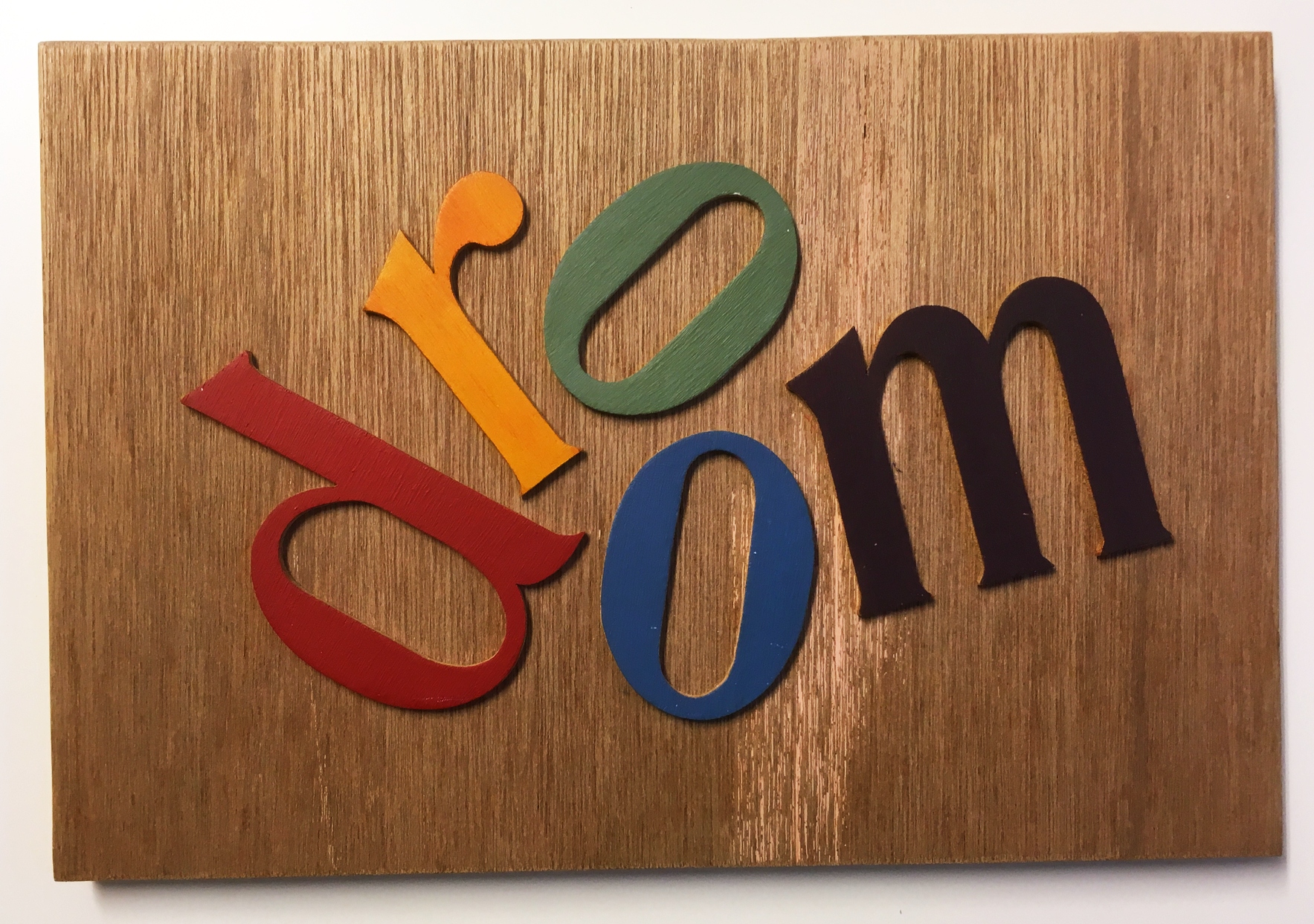 38. WITTENBERNS, Eric Trillingen. Zonder plaats, eigen beheer, ca. 1985? Oblong 16 x 21 cm. Houten platten met voorop een gestempelde titel en achterop de letters ‘U9’. Leporello van 14 bladen, in vele kleuren met biljetletters en sierranden bestempeld. Geen colofon.