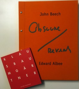 8. ALBEE, Edward, & John BEECH Obscure/ Reveal. (40 drawings on photographs by Beech, with words by Albee). New York, Peter Blum Editions, 2008. 42 x 31 cm. Linnen (zeer oranje). (102) p. Rijk geïllustreerd. Ontwerp en typografie Klaus Baumgärtner. Gedrukt in 750 copies. 1e druk. Mooi.