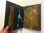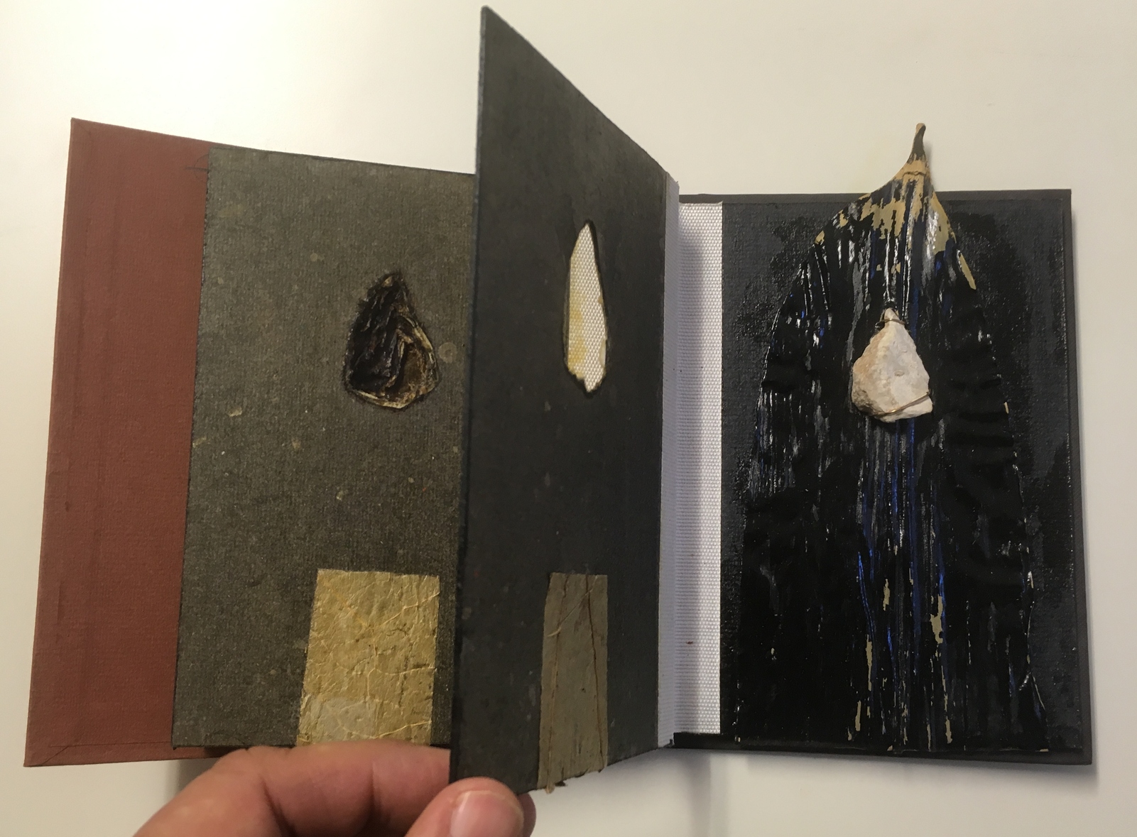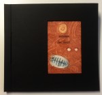 17. DEJONG Second (one of a quartet). Zonder auteur, uitgever, plaats of jaar. Unicum. 18 x 15 cm. Linnen. 16 ‘bladzijden’ van lstof en karton, beplakt met een blad, gelakt en bewerkt, zodat bij het omslaan een op een plantenblad bevestigde steen zichtbaar wordt.