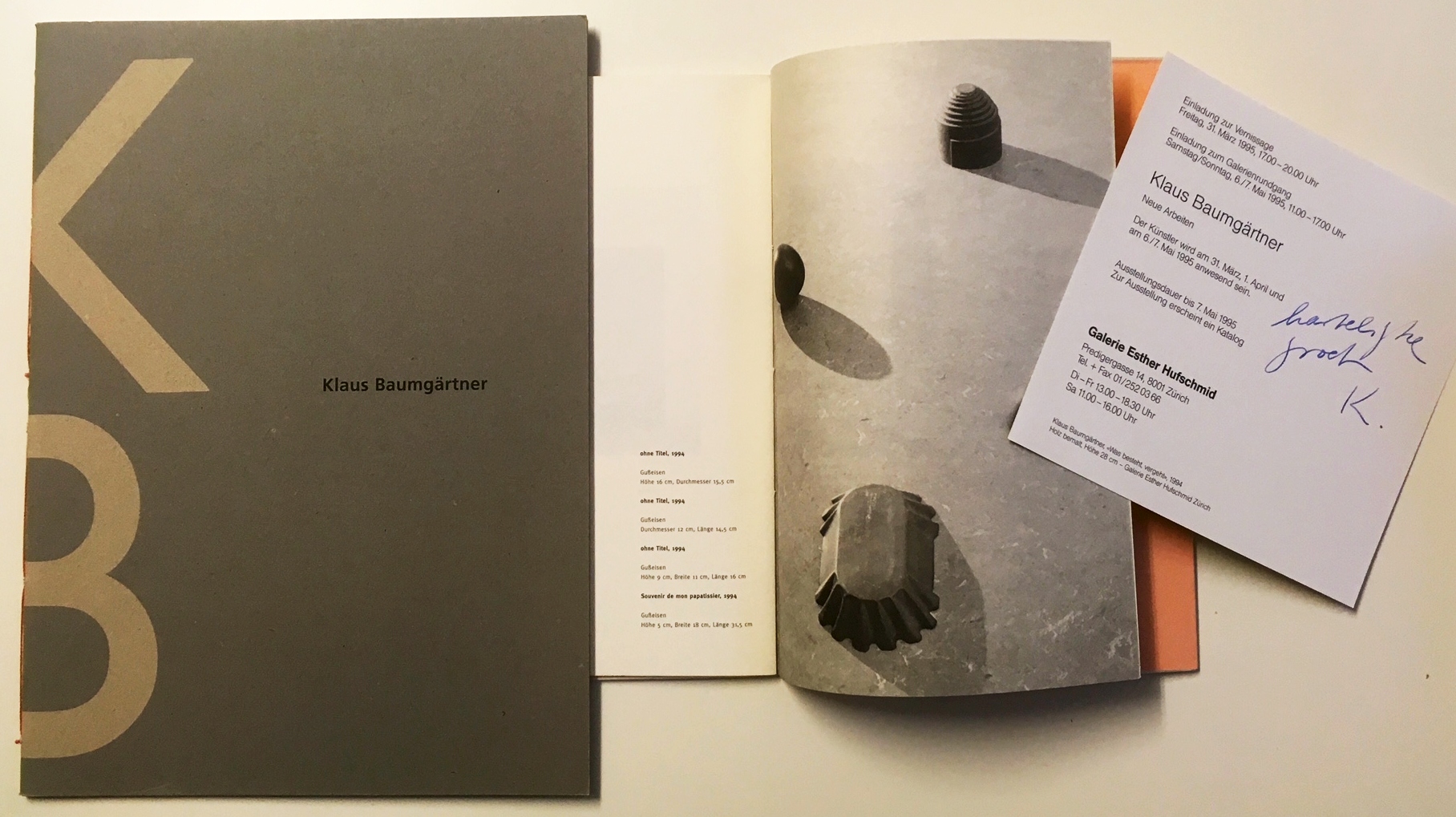 4. BAUMGÄRTNER, Klaus (Objecten). Zürich, Galerie Esther Hufschmid, 1995. 24 x 16 cm. Origineel omslag met flappen. 32 p. Foto’s in zwartwit met korte toelichting in het Duits. 1e druk.