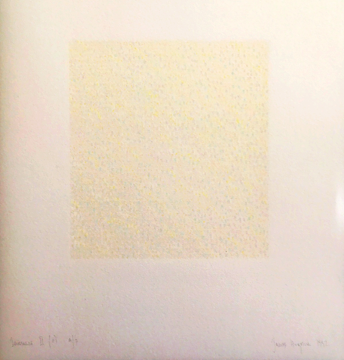* De subtiele kleurenlitho’s zijn bijkans onfotografeerbaar vanwege de van wit bijna niet te onderscheiden kleuren. Dit exemplaar (genummerd 492/500) heeft een losse extra litho op zwaarder papier (‘Jouissance II (ii)’), gesigneerd door de kunstenaar en genummerd A/P, kennelijk een van 16 extra prenten die niet in het colofon genoemd zijn.
