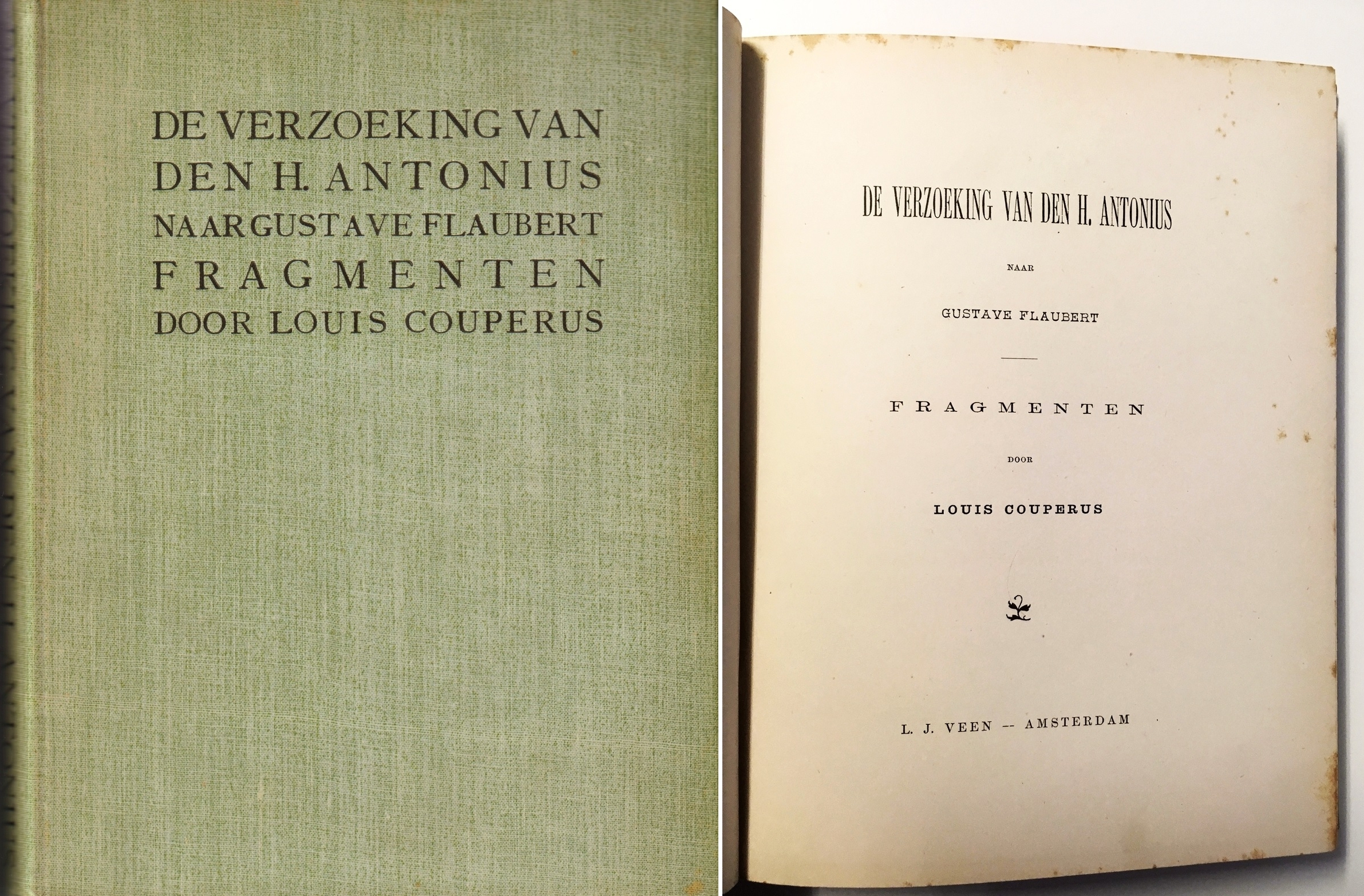 * Dit exemplaar heeft een ongewoon gave band. De lichtgroene versie. VV 171,1. Couperus was een groot bewonderaar van Flaubert, vooral van diens exotische roman Salammbô. Maar het toneelstuk La Tentation de St. Antoine (1874) heeft hij, in sterk verkorte vorm, als tijdverdrijf en oefening vertaald in 1894-1895, dus in de tijd van de koningsromans Wereldvrede en Hooge troeven. Qua tekst is het op en top Couperus, maar het boek heeft weinig aandacht gekregen in de Couperologie.