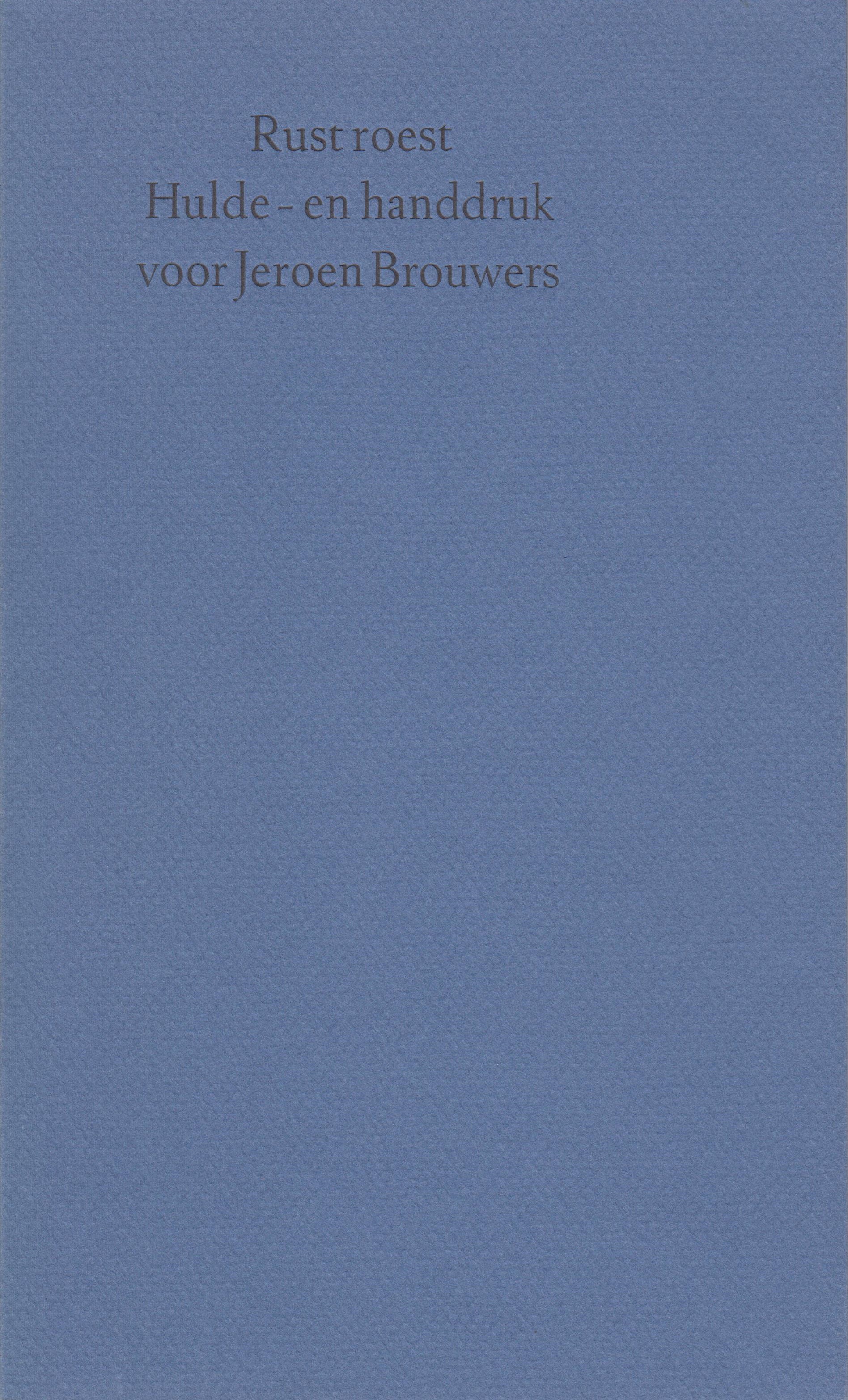 * Zeer schaarse uitgave ter gelegenheid van Brouwers’ dertigjarig schrijverschap, op verzoek van Carin Wevers en Tom van Deel. Bevat bijdragen van Benno Barnard, Walter van de Broeck, T. van Deel, Cherry Duyns, Hans Roest, Peter Yvon de Vries en Julien Weverbergh.