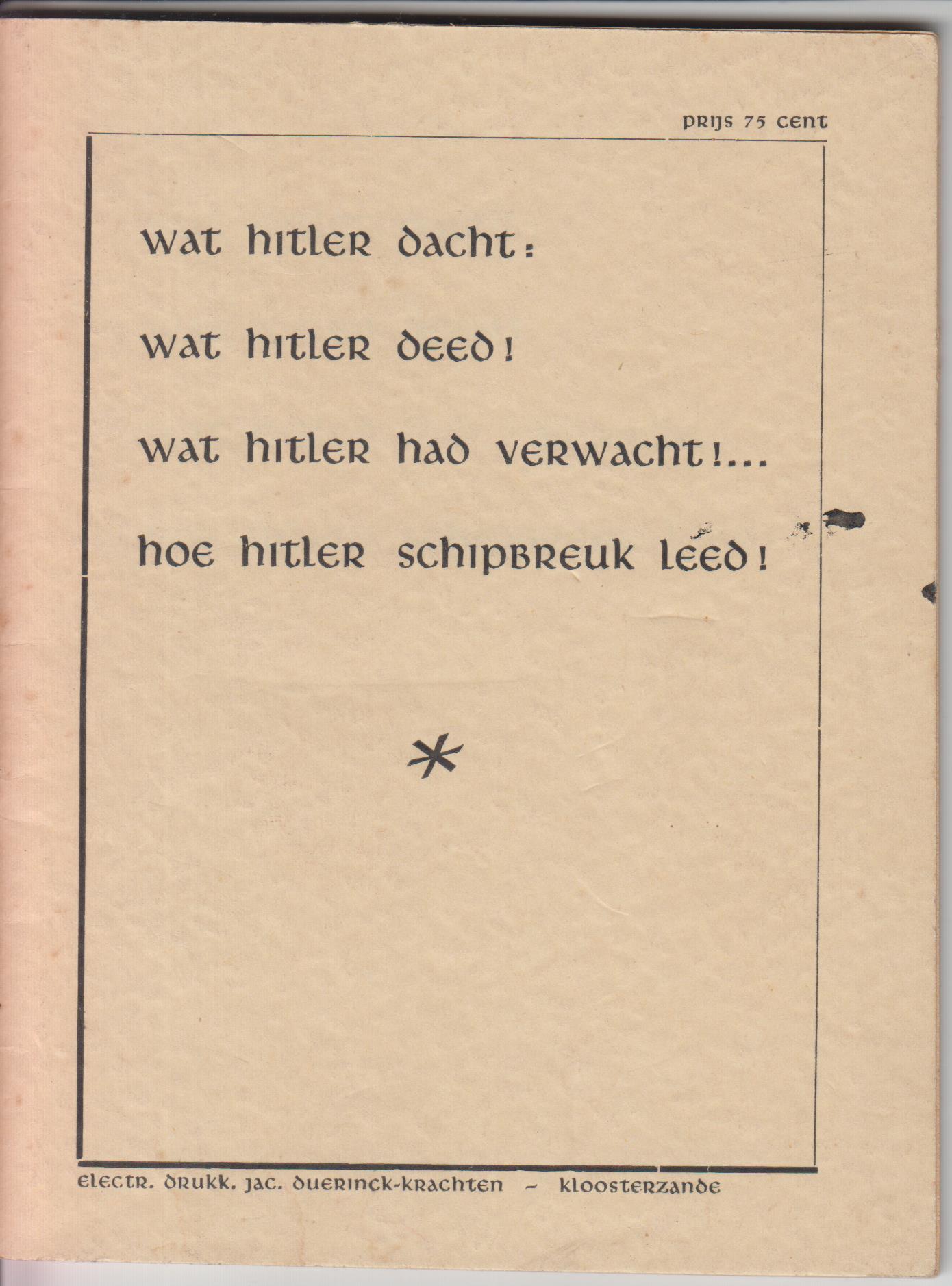 30. OORLOGSPOËZIE Wat Hitler dacht: wat Hitler deed! Wat Hitler had verwacht!… Hoe Hitler schipbreuk leed! Kloosterzande, Electr. drukk. Jac. Duerinck-Krachten, (ca. 1945). 15 x 12 cm. Geniet. 32 p. 1e druk. Inktvlekje op voorkant, verder mooi en gaaf.
