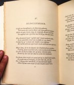 * De klassieke dichtbundel van Gossaert in klassieke eerste druk, een van de eerste uitgaven van de belangrijkste vooroorlogse bibliofiele uitgeverij. De poëzie van Gossaert kijkt nostalgisch naar ouder eeuwen om, en dat doet ook de letter Fleischmann in zijn plechtige Enschedé-typografie. Nobele donkerblauwe, toch zachte heellederen boekband. De Zilverdistel 3.