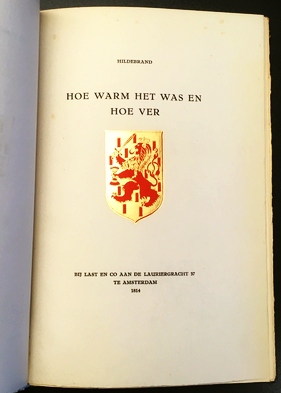 14. (HOES, F.). HILDEBRAND Hoe warm het was en hoe ver. (Illegale oorlogsuitgave). Amsterdam, F. Last & Co. (= F. Hoes), 1943. 26 x 17 cm. Halfperkament. 52 p. Niet afgesneden. Gedrukt in 250 genummerde exemplaren. 1e druk. Mooie conditie.