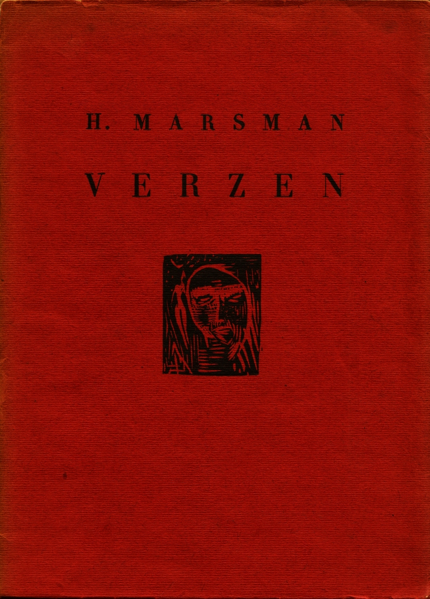 25. MARSMAN, H. Verzen. (Met een houtsnede van Erich Wichman op het omslag). Zeist, J. Ploegsma, 1923. Ingenaaid. 54 p. Debuut. 1e druk. Rug boven- en onderaan iets ingescheurd, maar een goed exemplaar. Contemporaine naam op voorste schutblad (moeilijk leesbaar, gedateerd ‘Jan. ’24’.).