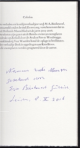 * Vanwege ziekte van Maarten Biesheuvel werd slechts een deel van de oplage door hem gesigneerd. Dit exemplaar is onder het colofon gesigneerd door de levensgezellin van de auteur: ‘Namens zieke Maarten/ getekend door/ Eva Biesheuvel Gütlich/ Leiden, 8-X-2016’.