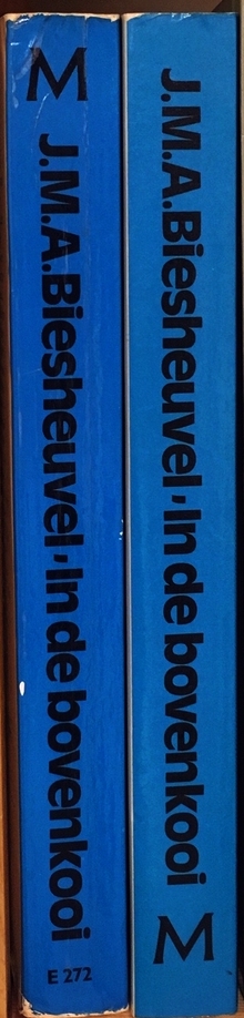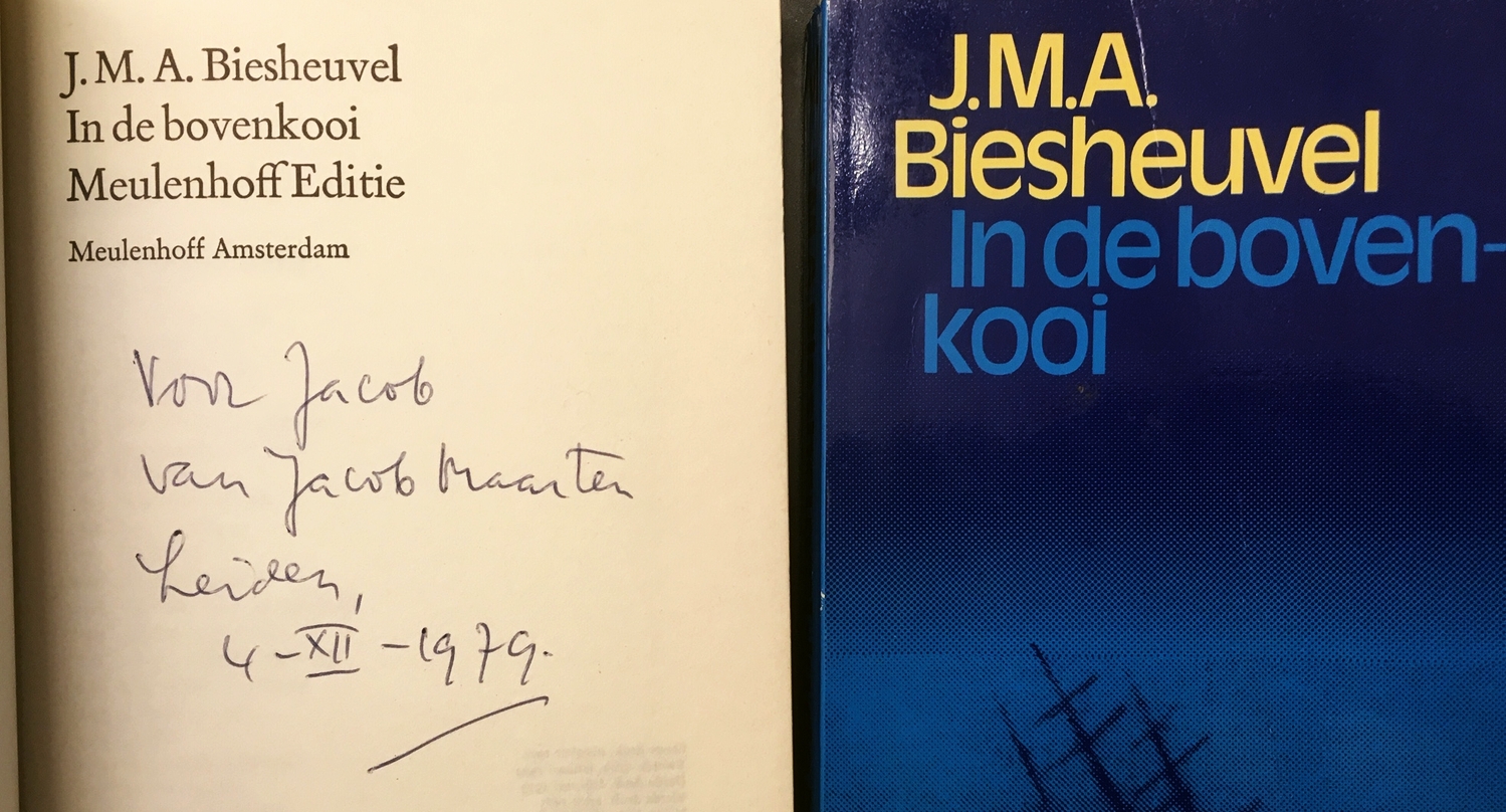 10. BIESHEUVEL, J.M.A. In de bovenkooi. (Met handgeschreven opdracht van de schrijver). Amsterdam, Meulenhoff, (1979). Garenloos. 240 p. 11e druk.
