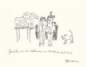 * Fleurige kaart van de Biesheuvels, die het echtpaar feliciteren met hun nieuwe woonst, met twee originele tekeningen van Biesheuvel: het hondje Mikkie en de poes Siepje de Krijser, de huisdieren. Geinig!