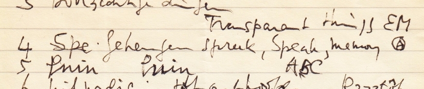 * Genummerde lijst van boektitels: ‘1 Glorie Glory EM/ 2 Bastaards Bend Sinister vO’ etcetera. Soms met de titel van de vertaling in het Engels of de oorspronkelijke Russische titel. Bij de eerste zeven is de uitgever genoteerd, vaak met een symbooltje. Zoals bekend is Biesheuvel een groot bewonderaar van Nabokov en heeft hij zich sterk door hem laten beïnvloeden. ‘Nabokov, Tsjechov, Conrad. Ik heb ze geïmiteerd, niemand die het merkte’ zei Biesheuvel in 2015 tegen de Volkskrant.