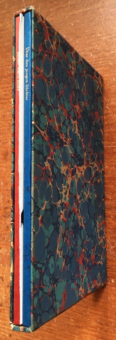 19. RILKE, Rainer Maria Über den jungen Dichter. (Met, los bijgevoegd, een houtsnede van Corrie Floor). Baarn, Arethusa Pers, (1991). Twee delen in gemarmerd foedraal. (40); (4), 36 p. Gedrukt door Jacques de Coo (deel 2 en colofon deel 1) in een oplage van 125 genummerde exemplaren. Met erratablaadje.