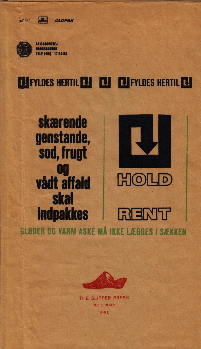 16. PUETTMANN, Emile Hold Rent. Rotterdam, The Slipper Press, 1980. 22 x 13 cm. Karton met stofomslag. Circa 19 ‘bladen’. Typografische oefening op basis van een Deense papieren vuilniszak. Gemaakt door Emile Puettmann en Joop Peynenburg in 30 genummerde exemplaren. 1e druk. Mooi.