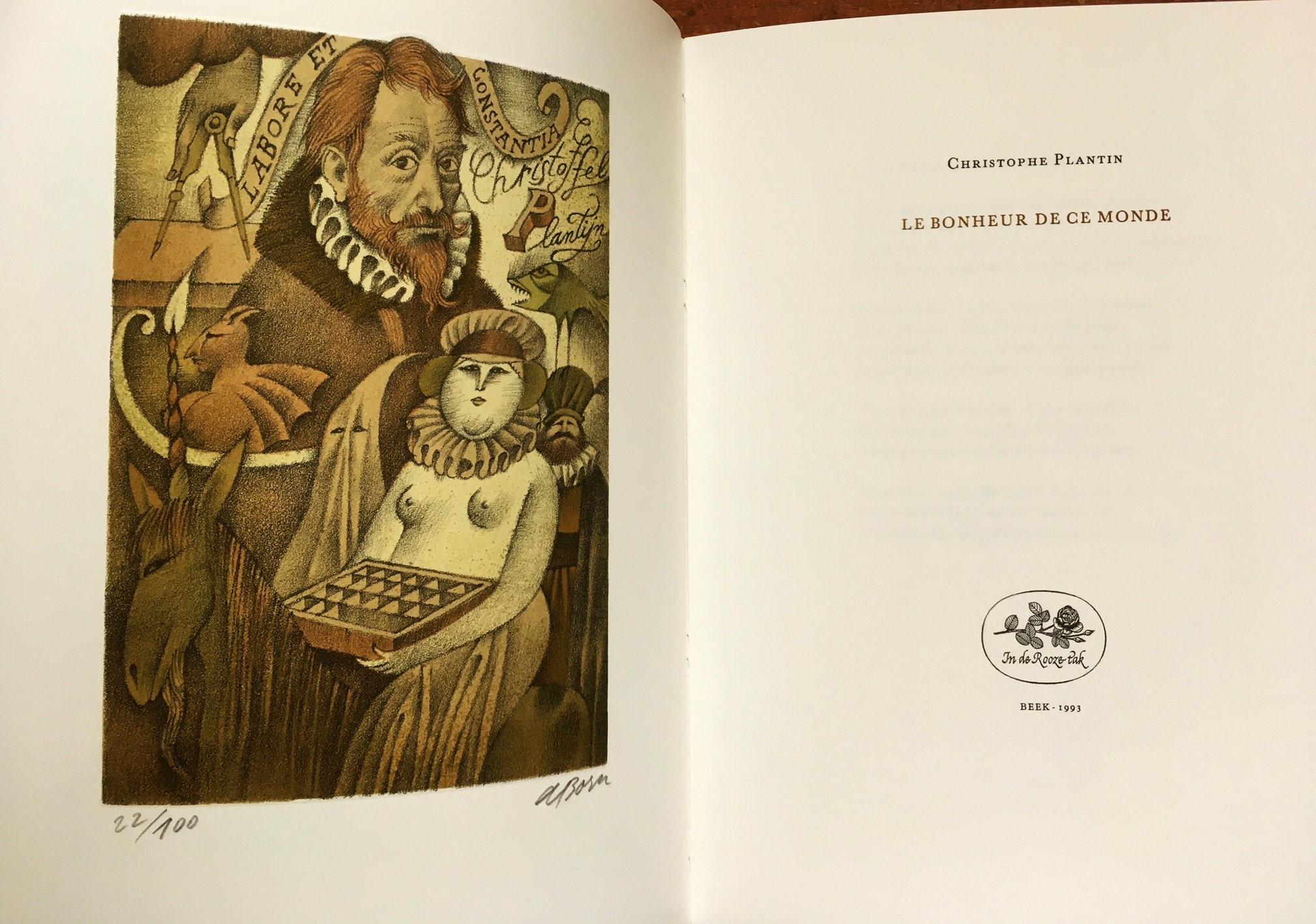 * Dit is een van 30 in linnen gebonden exemplaren (naast 5 in halfleer en 40 gebrocheerd), door Geert van Daal. Nawoord van de uitgever, Johan Souverein. Bijzonder fraai boek, een hommage aan Plantijn ter gelegenheid van zijn vierhonderdste sterfdag met vrolijke prent van de in Tsjechië zeer geliefde Adolf Born (1930-2016).