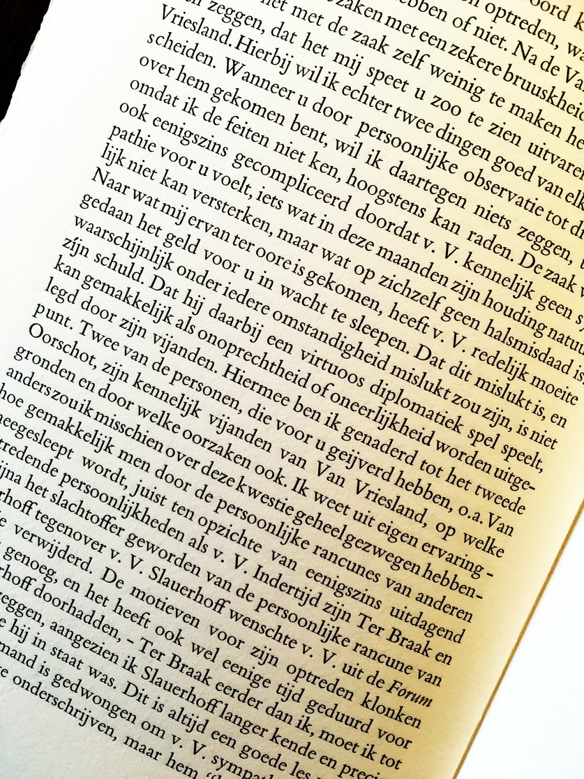 * De brief van Anna Blaman gaat over het onthouden van de reisbeurs aan Reve door minister Cals in 1951, Ida Gerhardt klaagt dat ze na de toekenning van de P.C. Hooft-prijs zoveel post ontving dat het haar het werken belet, Bomans schrijft Reve over diens toetreden tot de Rooms-Katholieke Kerk. Fraaie bibliofiele productie, doordacht en georganiseerd door Gert Jan Hemmink en uitgevoerd door de buitengewoon kundige margedrukker Hein Elferink en de legendarische boekbinder David Simaleavich van Binderij Phoenix. Het moest precies goed zijn, en dat is het ook. AMO 10, 11, 12.