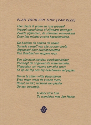 33. CAMPERT, Remco, en Jan HANLO Plan voor een tuin (van Klee) [en:] Het dak. (Gesigneerd). (Leiden, De Uitvreter, 1994). Tweemaal gevouwen plano. Met de hand gezet uit de Univers en de Helvetica en gedrukt in blauw en groen in een oplage van 190 exemplaren. Kruis in balpen op omslag.