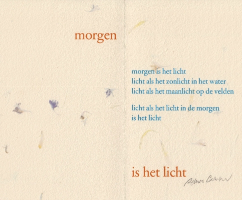15. CAMPERT, Remco Morgen is het licht. (Baarn, Atalanta Pers, 2004). Vouwblad in omslag. Met de hand gezet en gedrukt in roodbruin en blauw op handgemaakt papier met bloemetjes in een beperkte oplage.