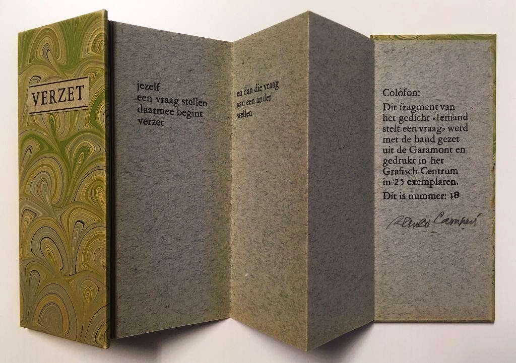 * Klein accordeonvormig boekje. Gesigneerd door de dichter onder het colofon. Fragment uit het gedicht ‘Iemand stelt een vraag’.