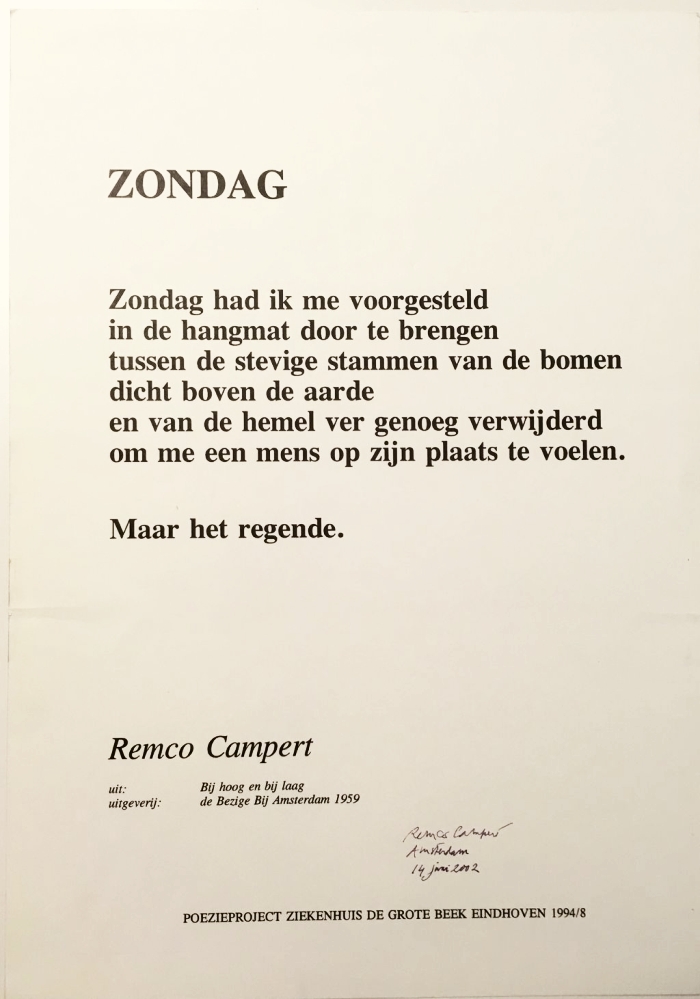 * Gesigneerd door de dichter: ‘Remco Campert/ Amsterdam/ 14 juni 2002’. Dit gedicht werd overgenomen uit de bundel Bij hoog en en bij laag (Amsterdam, De Bezige Bij, 1959) en werd uitgegeven buiten medeweten van de auteur. Niet in de NCC.