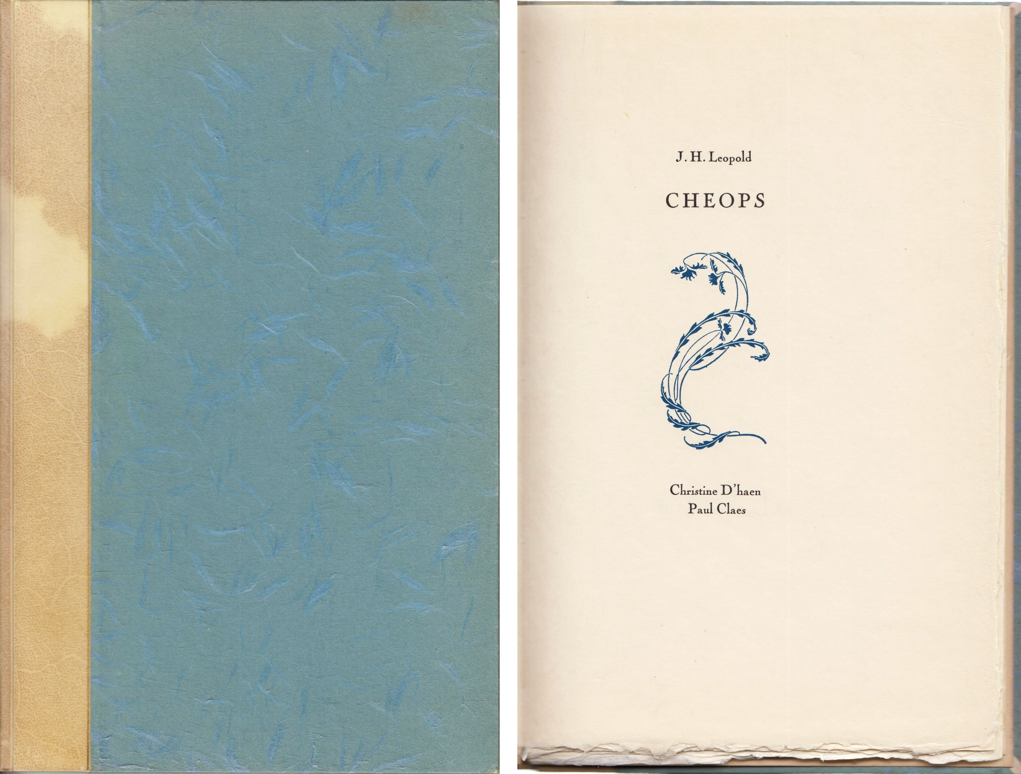 20. LEOPOLD, J.H. (CLAES, Paul, en Christine d’HAEN Cheops. (Met een Engelse vertaling door Christine d’Haen en Paul Claes). (Amsterdam, De Regulierenpers, 1985). Verguld halfperkament met platten van schitterend Japans vezelpapier (Binderij Phoenix). 40 p. Met de hand gezet uit de Gravure en gedrukt in blauw en zwart op Antiek Vergé in een oplage van 75 genummerde exemplaren. Tweetalige uitgave.