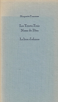 28. YOURCENAR, Marguerite Les Trente-Trois Noms de Dieu. Le livre d’adresse. Sonnega, Regulierenpers, 1988. Ingenaaid met stofomslag. (24) p. Met de hand gezet uit de Gravure en gedrukt in groen, grijs en blauw op Bütten-Kanzlei in een oplage van 70 op de pers genummerde exemplaren. Omslag deels (fors) verschoten.