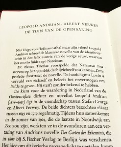 b. Leopold ANDRIAN, De tuin van de openbaring. Vertaald door Albert Verwey en Stefan George. Amsterdam, (Astèr), 1984. Verguld donkerrood halfmarokijn met platten overtrokken met vezelig Japans papier (Binderij Phoenix). (4), 52 p. Gezet uit de Spectrum en gedrukt door Geuze naar typografische aanwijzingen van Ger Kleis in een oplage van 125 genummerde exemplaren. Bovenrand voorplat circa 8 mm. verschoten.