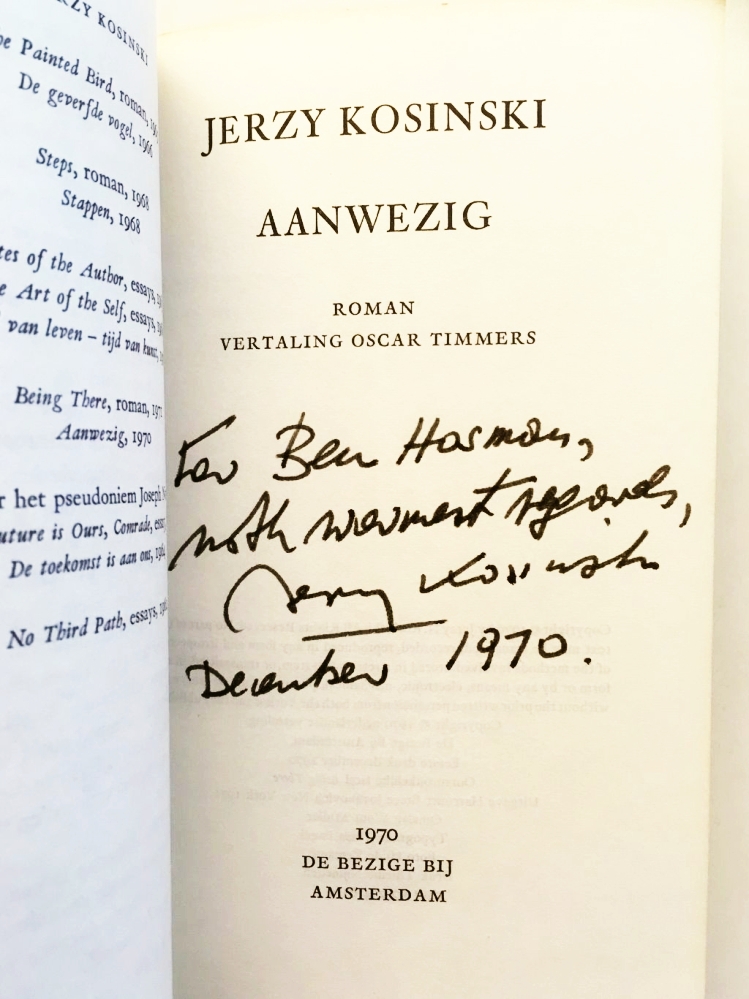 29. KOSINSKI, Jerzy Aanwezig. Roman. Vertaling Oscar Timmers. Amsterdam, De Bezige Bij, 1970. Garenloos. 160 p. 1e druk.