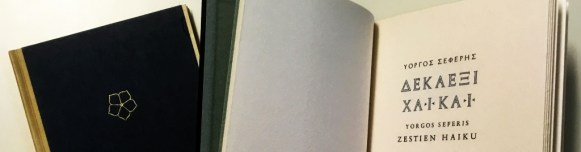 4. SEFERIS, Yorgos Zestien haiku. Vertaald door G.H. Blanken. Amsterdam, Aster, 1986. Verguld halfperkament met perkamenten voorrand. 20 p., op Chinese wijze gebonden (Binderij Phoenix). Met de hand gezet uit de Antigone, de Griekse Open Kapitaal en de Romanée en gedrukt op Hosho-papier door Ger Kleis in blauw en zwart in een oplage van 125 genummerde exemplaren.