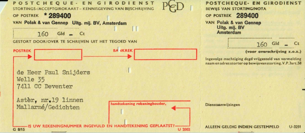 * Onder het colofon op naam uitgeschreven voor Johan Polak. Tweetalige editie. Astèr 1.