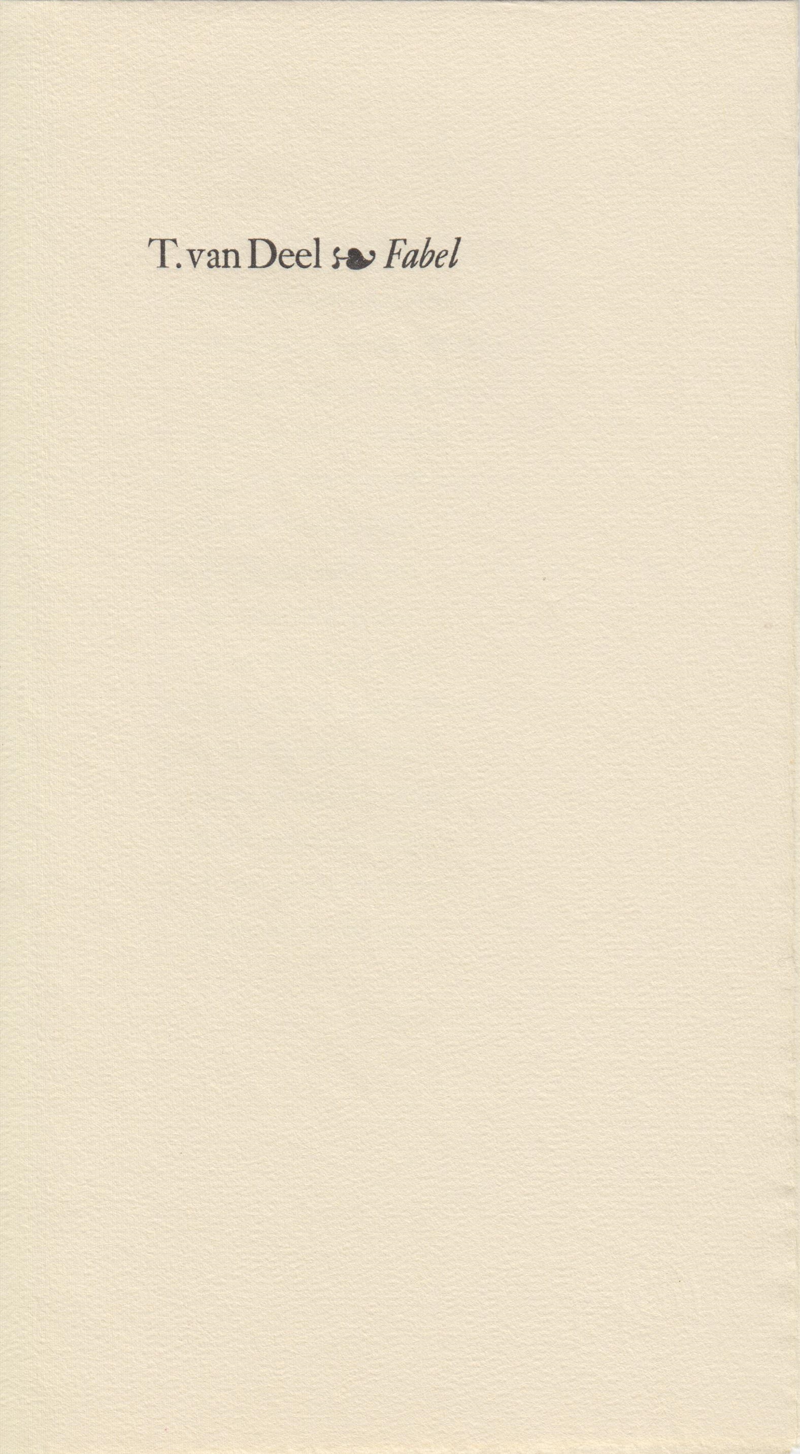 4. DEEL, T. van Fabel. (Gedrukt in slechts 18 exemplaren). (Amstelveen, de Zondagsdrukkers, 1984). Vouwblad. Met de hand gezet uit de Janson en gedrukt op Hahnemühle-Ingres door Reinold Kuipers in een oplage van 18 exemplaren.
