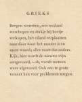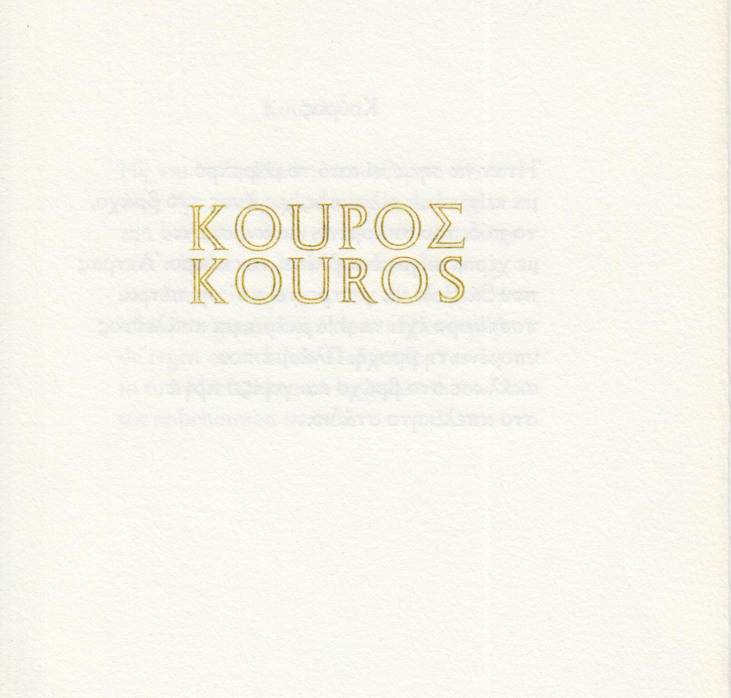 9. DEEL, T. van Kouros. (Met een vertaling in het Nieuwgrieks door Arnold van Gemert). Sub Signo Libelli, 1985. Losbladig in omslag. (12) p. Met de hand gezet uit de Antigone en Romanée en gedrukt in goud en zwart op Zerkall Bütten in een oplage van 66 genummerde en gesigneerde exemplaren. 1e druk.