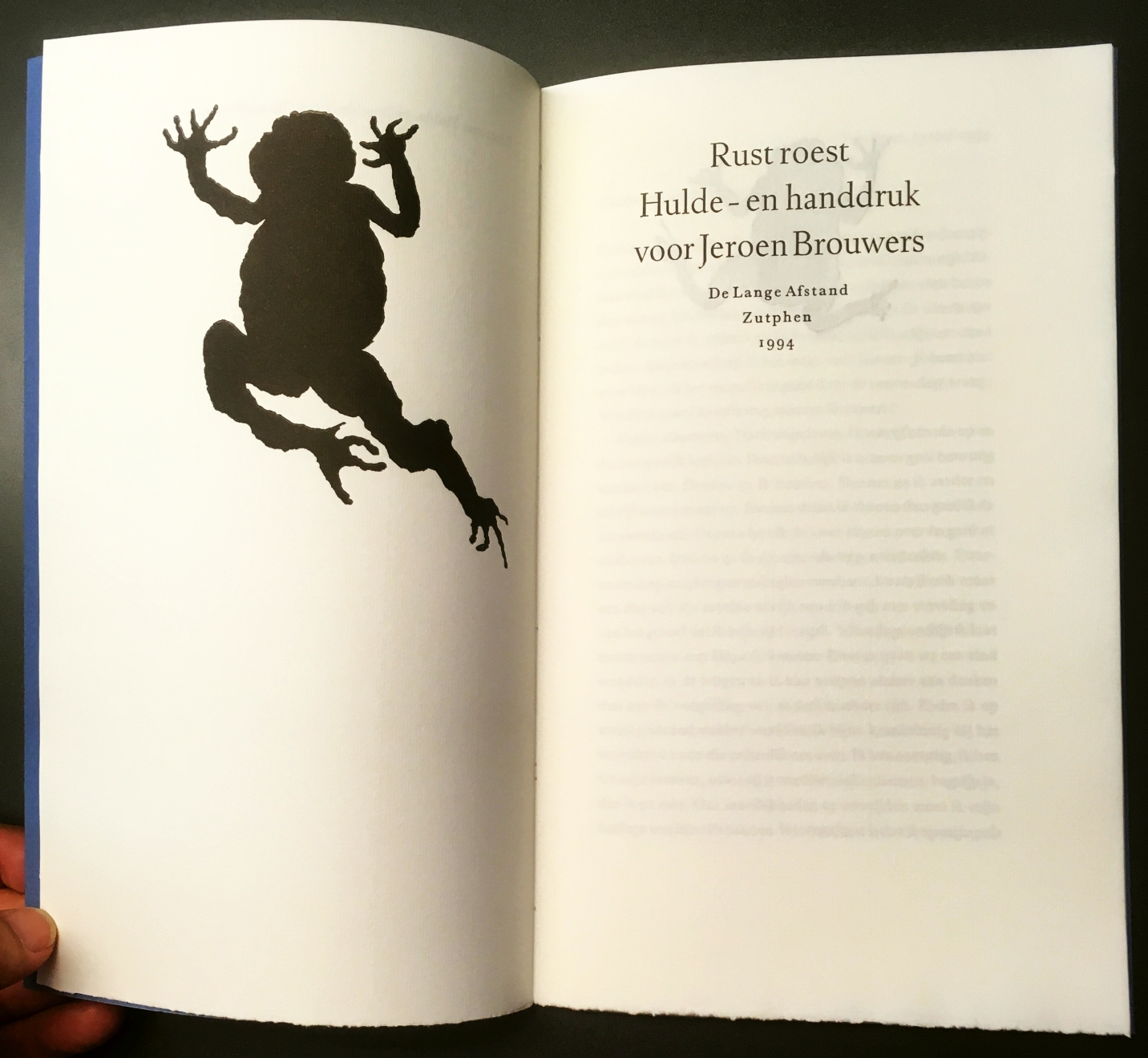 20. (BROUWERS, Jeroen) Rust roest. Hulde- en handdruk voor Jeroen Brouwers. (Met linoleumsneden van Peter Yvon de Vries). Zutphen, De Lange Afstand, 1994. Ingenaaid. (24) p. Met de hand gezet uit de Baskerville en gedrukt door Peter Yvon de Vries op Zerkall-Bütten in een oplage van 40 exemplaren. 1e druk.