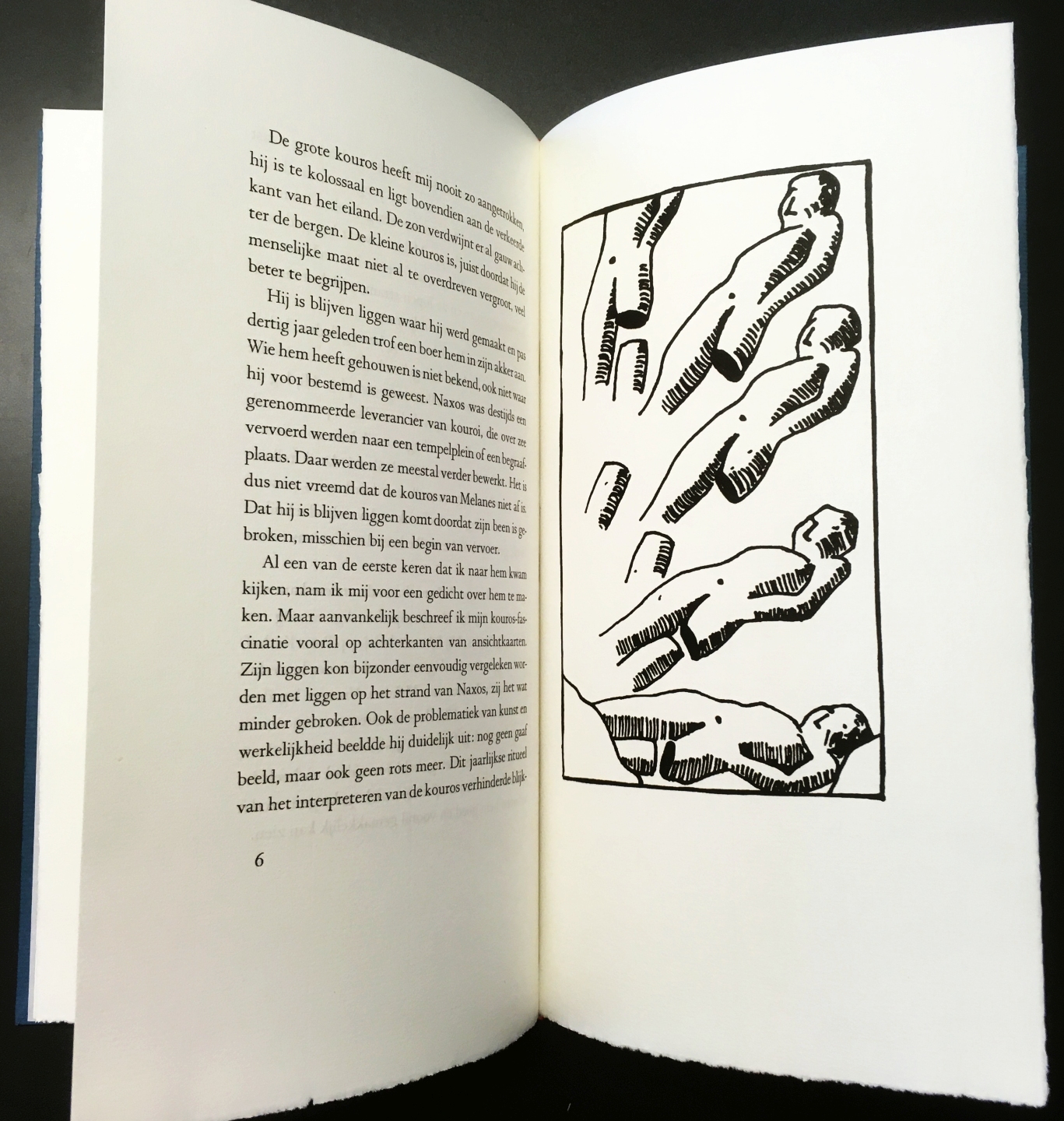 3. DEEL, T. van De kleine kouros van Naxos. Met een tekening van Charlotte Mutsaers. Den Haag, Mikado Pers, 1988. Zwart halfmarokijnen rug met platten met blindpreegdruk. (6), 18 p. Met de hand gezet uit de Romulus en gedrukt op Zerkall-Bütten in een oplage van 85 exemplaren. 1e druk.
