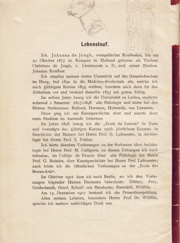 * Met ‘v.d.s.’ (‘van de schrijfster) in handschrift op de voorzijde. Op dit proefschrift promoveerde Johanna de Jongh (1877-1946) als eerste vrouw bij de faculteit der kunstgeschiedenis in Berlijn (cum laude, bij Heinrich Wölfflin). Zij trouwde in 1905 met de onroerendgoedmagnaat en hellenofiele amateurarcheoloog Adriaan Goekoop (na diens mislukte huwelijk met de feministische schrijfster Cecile de Jong van Beek en Donk). Na Adriaans overlijden in 1914 was Johanna Goekoop-de Jongh vooral op archeologisch gebied een groot mecenas, maar ook verkocht zij haar villa aan de Alexanderstraat in Den Haag voor een vriendenprijsje aan de na lange worsteling wederopgestane, jonge natie Griekenland om daar de ambassade in te vestigen (die er nog steeds zit).