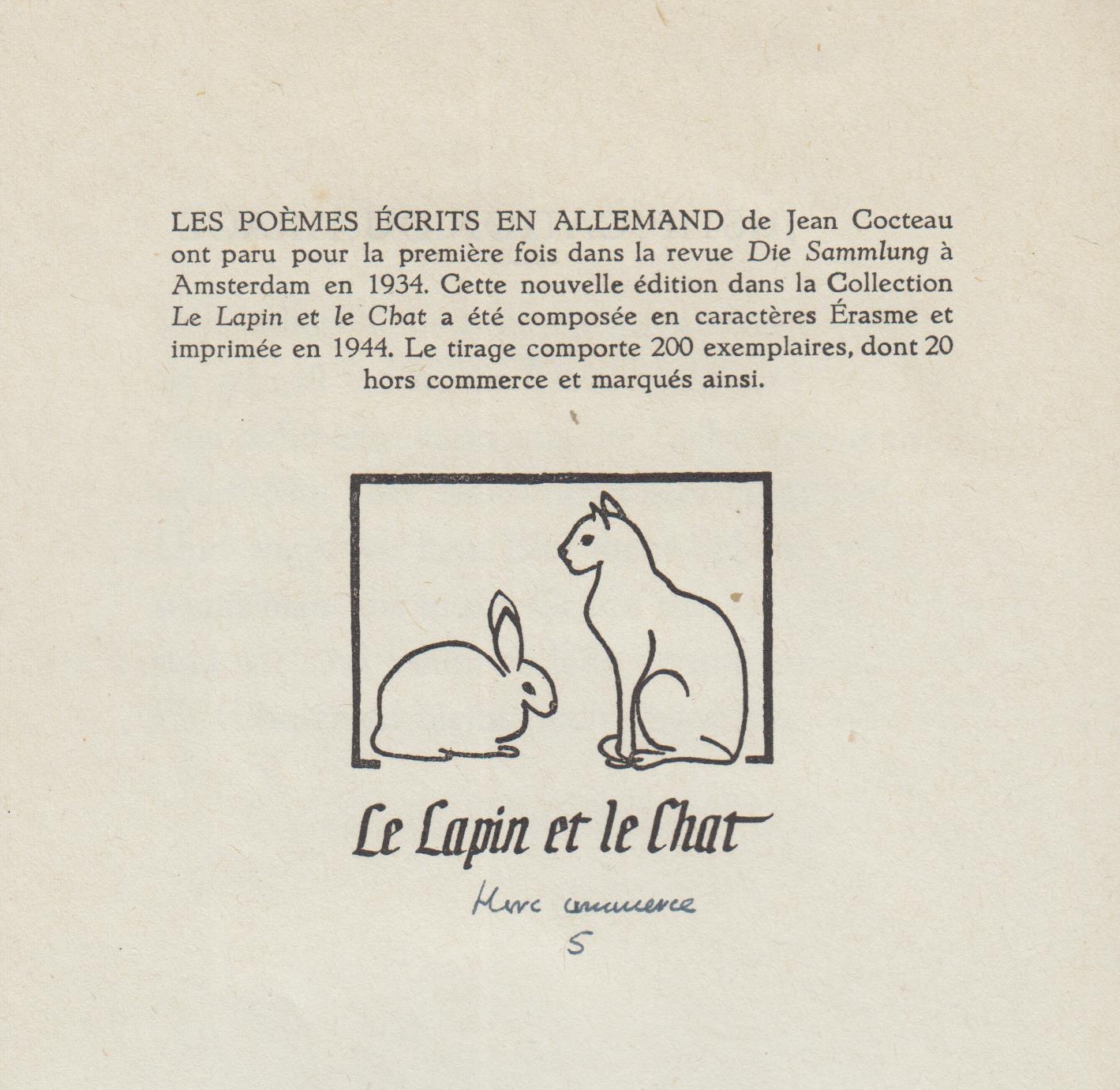 7. COCTEAU, Jean Poèmes écrits en Allemand. [Den Haag], Le Lapin et le Chat, 1944. 25 x 16 cm. Cahiersteek. 12 p. Gezet uit de Erasmus en gedrukt in 200 exemplaren. 1e druk. Omslag aan de randen wat verbleekt.