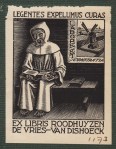 29. ESCHER, M.C. Origineel exlibris voor mevrouw [Anthonette F.C.] Roodhuyzen de Vries-Van Dishoeck. Houtgravure van M.C. Escher. [1942]. Bladgrootte 9,0 x 6,9 cm. Houtgravure meet 8,1 x 6,1 cm. Onderaan geplakt op een uitgescheurd schutblad van geschept papier. Aan de randen wat aangeknabbeld (?) en met onderaan het handgeschreven nummer 1173.