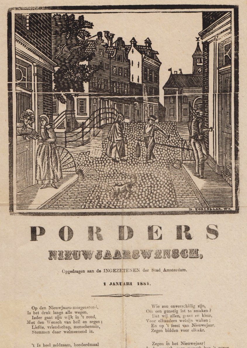2. (BEDELPRENT PORDERS AMSTERDAM). CORDES, K.F.L. Porders Nieuwjaarswensch, opgedragen aan de Ingezetenen der Stad Amsterdam. 1 Januari 1881. Amsterdam, Wed. C. Kok, geb. Van Kolm, 1881. Met grote houtsnede van D. Tollenaar Wz. (primitief, met barstlijnen). Eén vel, eenzijdig bedrukt. 34 x 21 cm. Wat gekreukt. Op de blanco achterkant wat notities en een plakzegeltje.