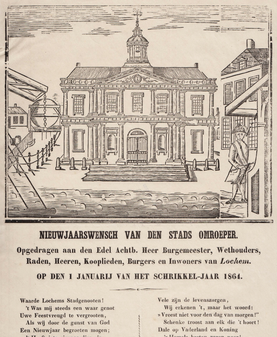 3. (BEDELPRENT STADSOMROEPER LOCHEM). ACHTERDENBOSCH, H. Nieuwjaarswensch van den Stads Omroeper, opgedragen aan den Edel Achtb. Heer Burgemeester, Wethouders, Raden, Heeren, Kooplieden, Burgers en Inwoners van Lochem. Op den 1 Januarij van het Schrikkel-jaar 1864. Zutphen, W.C. Wansleven, [1863]. Met grote houtsnede, een fantasierijke voorstelling van het Lochemse stadhuis. 33 x 21 cm. Eén vel, eenzijdig bedrukt. Op een groter vel oud geschept papier geplakt. Wat gekreukt. Op de blanco achterkant wat notities en een plakzegeltje.