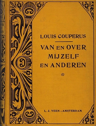 9. COUPERUS, Louis Van en Over Mijzelf en Anderen. [Eerste bundel]. Amsterdam, Veen, [1910]. Linnen (ontwerp W[illem] J[iddo] T[aanman]). 220 p. 1e druk. Achterplat (blanco) wat gebobbeld. Randen van de rug wat versleten. Van binnen in matige staat: schutblad uitgesneden, inhoudsopgave ligt los, wat roestig.