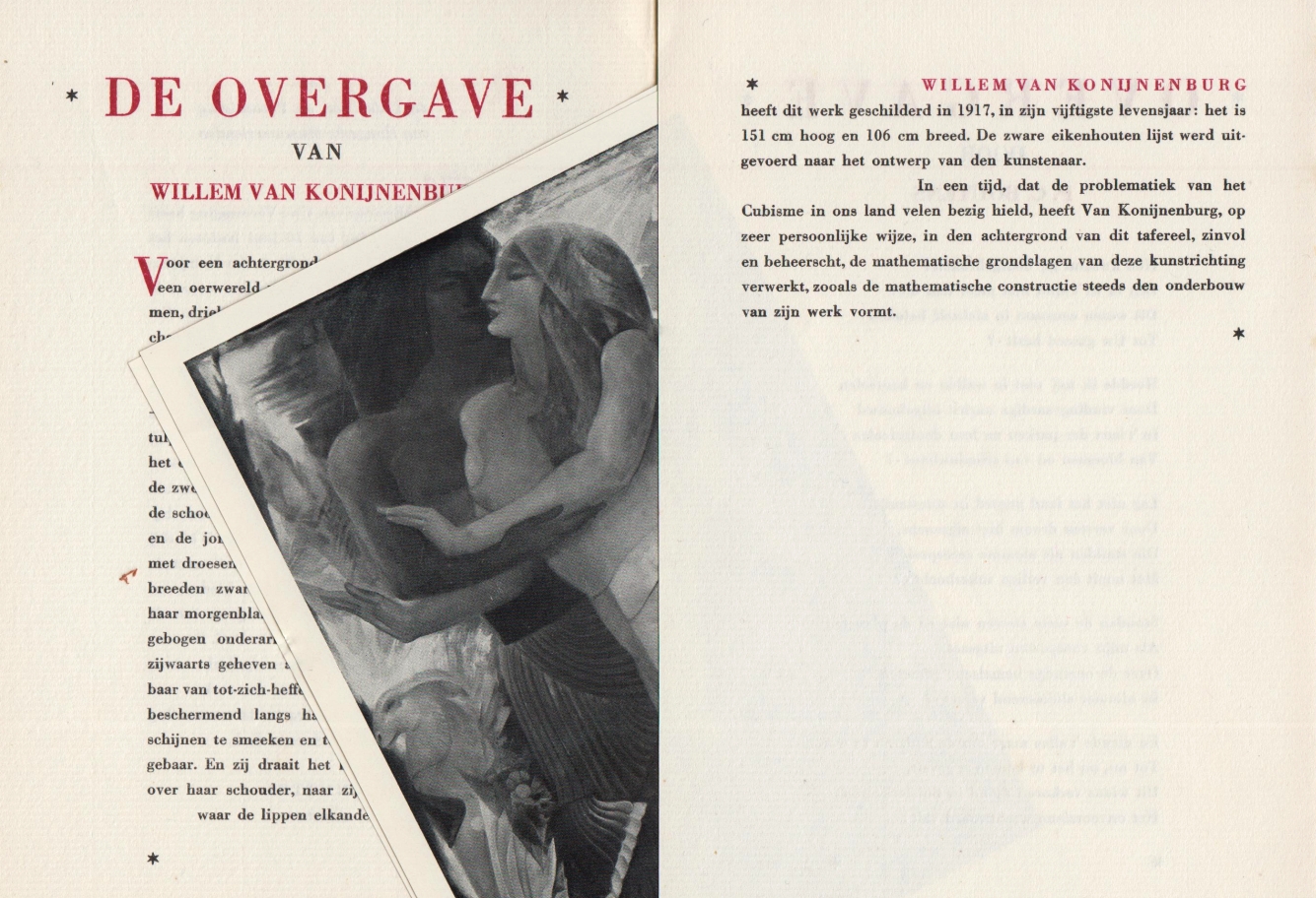14. (DRUKKERIJ TRIO). BOUTENS, P.C. / Willem VAN KONIJNENBURG De overgave. / Overgave. In: Aan de Leden van de Vereeniging van Haagsche Museumvrienden. [1941]. Uitvouwblad met, los bijgevoegd, twee afbeeldingen van het schilderij De overgave. Met op de binnenzijde van het rechteruitvouwblad het gedicht ‘Overgave’ van Boutens. 1e druk. Prachtig exemplaar.