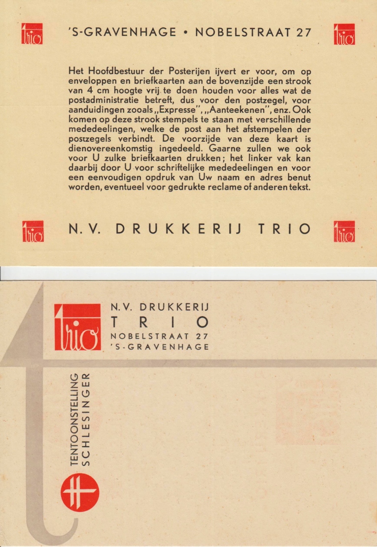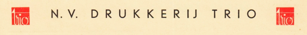 21. (DRUKKERIJ TRIO). STOLS, A.A.M. Onze directie ondergaat enige wijziging. (Strooibiljetje). Den Haag, Drukkerij Trio, 1944. 10 x 7,5 cm. Gevouwen velletje geel papier, gedrukt in twee kleuren rood. Gaaf.