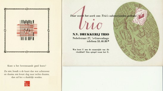 * Reclameuitgaafjes met kleine grapjes van Drukkerij Trio, tegenwoordig onvindbaar. Bijgevoegd: een vloeiblad met cartoon.