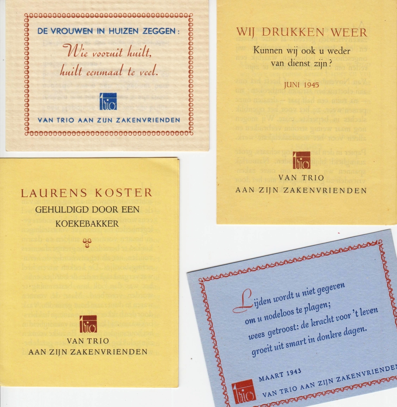 * Kleine publicaties die wellicht bij zakelijke post werden gevoegd, met citaten (o.a. van Berlioz, Bilderdijk, Horatius en Vondel) om de moed erin te houden, maar ook een aankondiging dat Trio weer functioneert (juni 1945) en het opstelletje Laurens Koster gehuldigd door een koekebakker met afbeelding van een nieuwe koek in oude vorm gebakken! De drie 1943 gedateerde velletjes kunnen als clandestiene publicaties beschouwd worden: een K-nummer ontbreekt en het zijn kleine steken onder water tegen de nazi-bezetting.